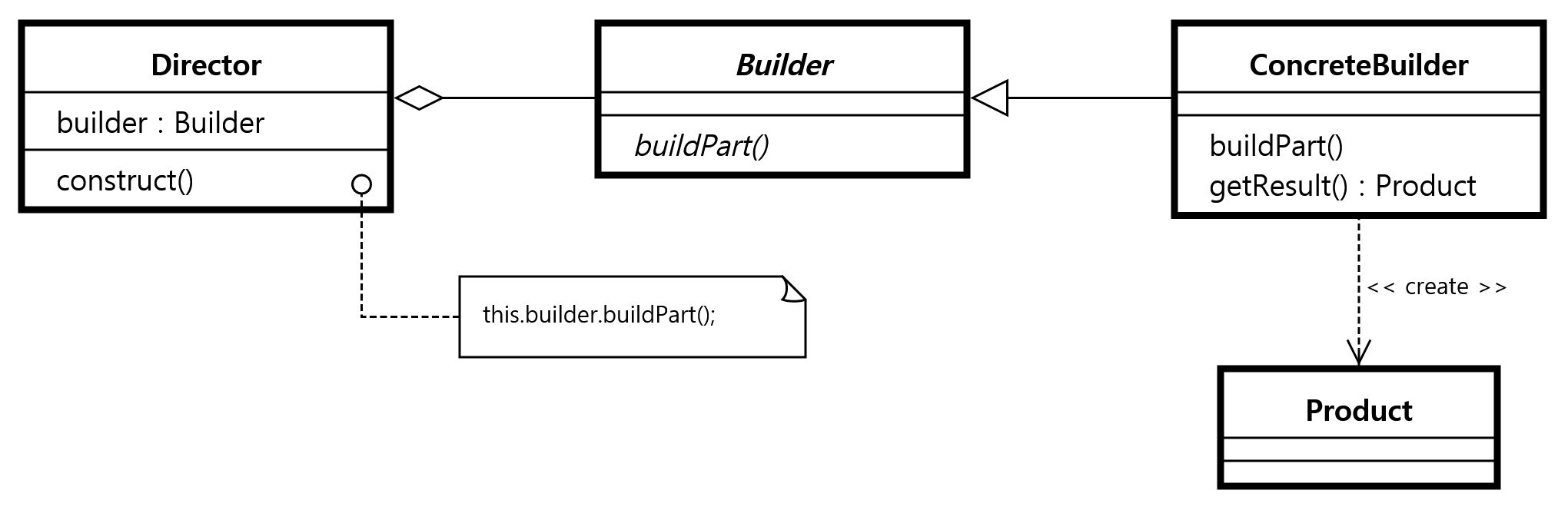 - 빌더 인터페이스 (Builder Interface, 선택적): 빌더 클래스를 구현하기 위한 인터페이스입니다. 복잡한 객체 생성에 대한 일관된 인터페이스를 제공할 수 있습니다.